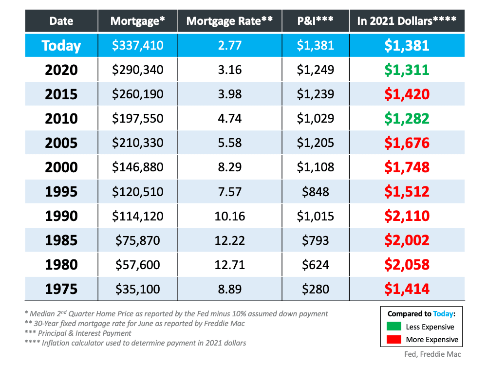 Let’s look back at the cost of a home over the last five decades and adjust it for inflation by converting that cost to 2021 dollars. Here’s the methodology for each data point of the table below: