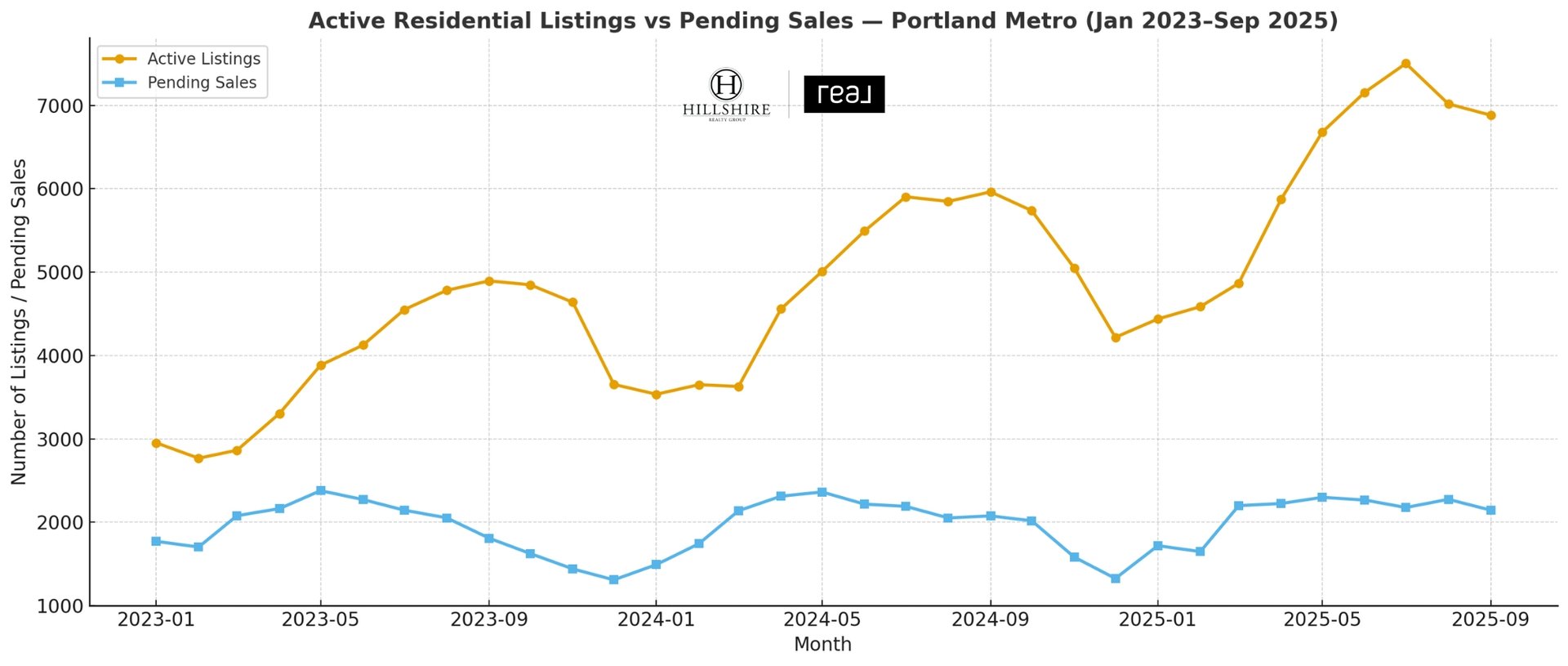 From January 2023 through September 2025, active residential listings have climbed steadily during each spring and summer. By mid-2025, active inventory peaked above 7,500 listings, the highest level we’ve seen in years.