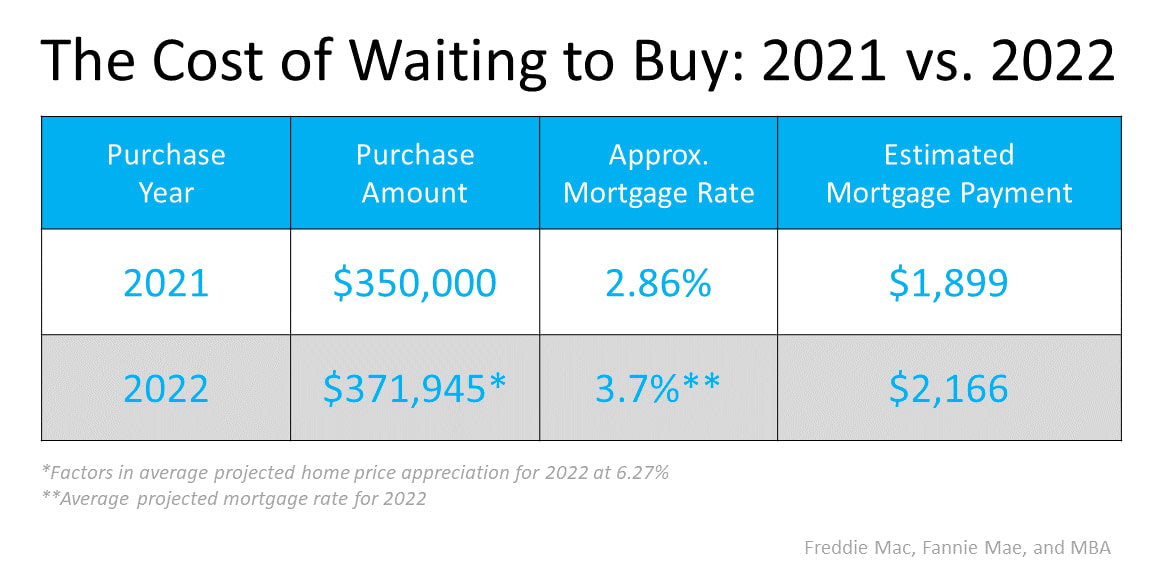 Using the average of the three projections (6.27%), a home that sells for $350,000 today would be valued at $371,945 by the end of next year. That means, if you delay, it could cost you more. As a prospective buyer, you could pay an additional $21,945 if you wait.